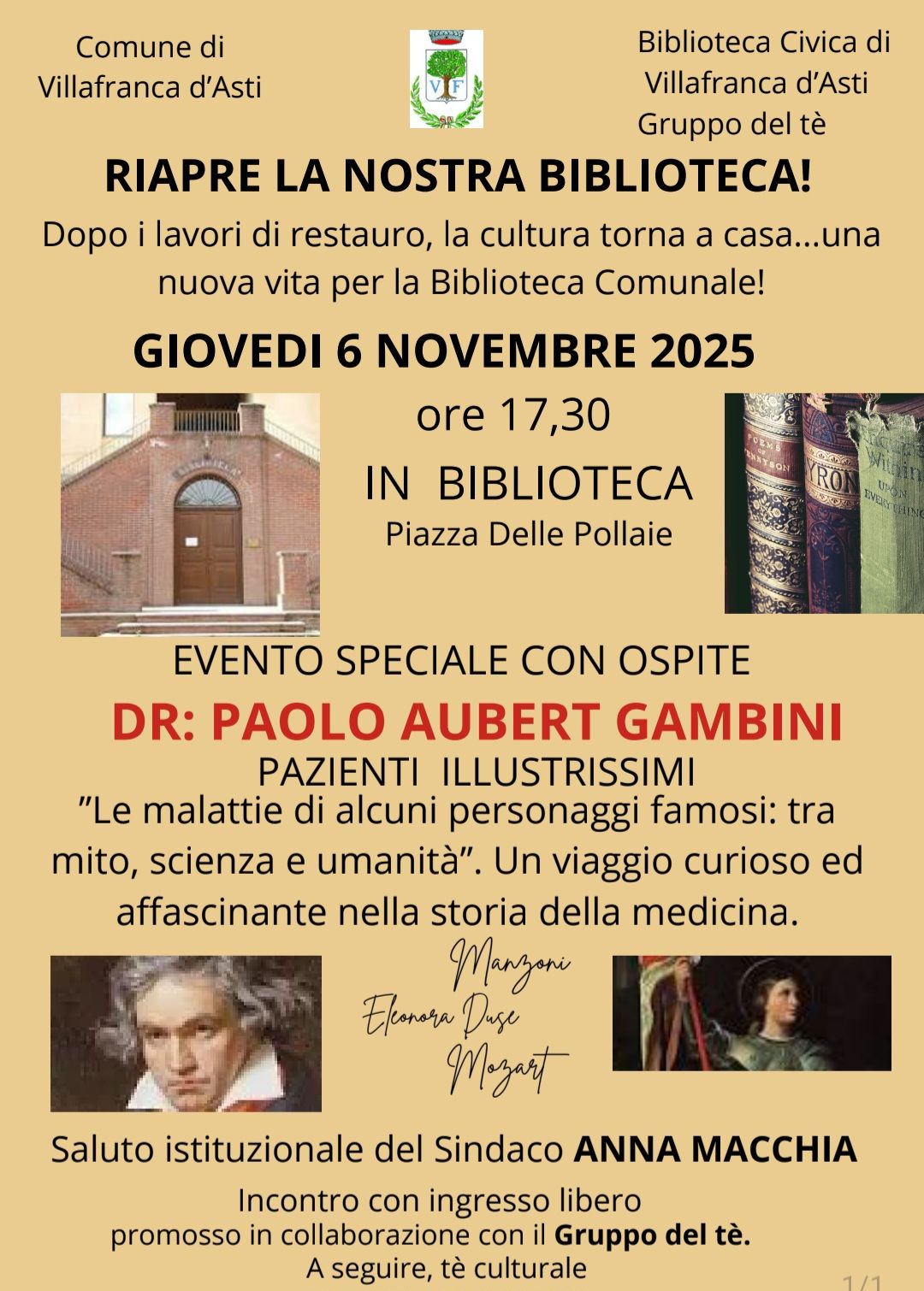 Dalle ore 17,30 EVENTO SPECIALE con il Dott. Paolo Aubert Gambini incontro con ingresso libero "PAZIENTI ILLUSTRISSIMI - Le malattie di alcuni personaggi famosi: tra mito, scienza e umanintà." Un viaggio curioso ed affascinante nella storia della medicina.